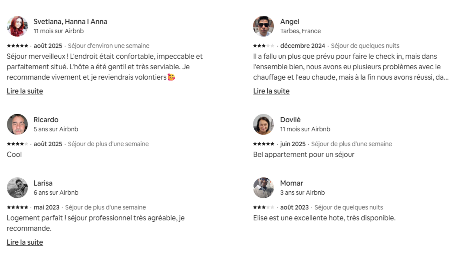 Tous les avis laissés sur Airbnb concernant notre gîte sont authentiques et publics. Nos voyageurs soulignent régulièrement la propreté des lieux, la qualité de l’accueil, les équipements (dont la piscine) et la convivialité des espaces partagés.